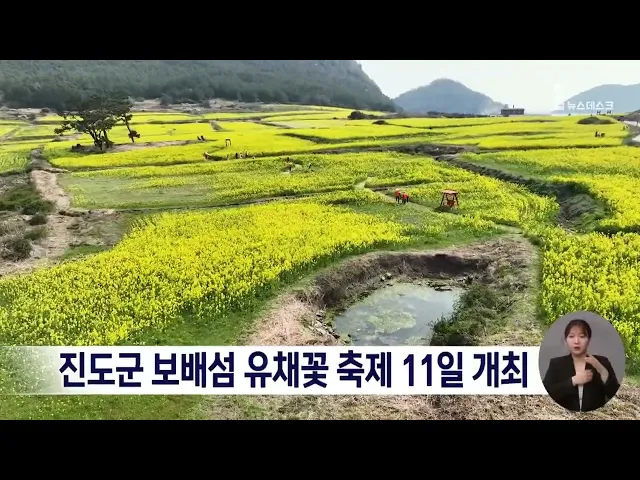 진도군이 조도면 관매도에서오는 11일부터 사흘동안 유채꽃 축제를 개최합니다.지난해 9곳에서 진행했던 유채꽃 축제는올해 관매도에서만 열리며특산물을 활용한 먹거리 장터와문화 공연 등이 펼쳐집니다.진도군은 축제기간 진도항에서 관매도를 오가는 여객선을 2회 늘려 하루 4차례 운행된다고 밝혔습니다.