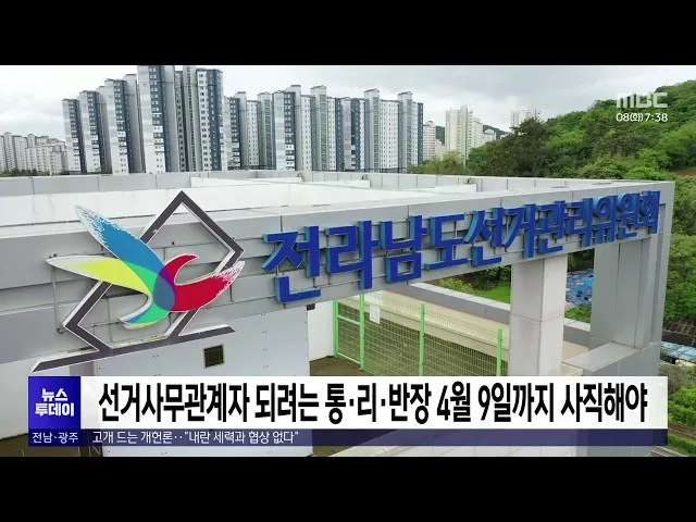 제21대 대통령선거에서 통·리·반장이 선거사무관계자가 되려면오는 9일까지 사직해야 합니다.통·리·반장 등은 공직선거법에 따라대통령선거 실시사유가 확정된 때인 지난 4일부터 닷새 뒤인 오는 9일까지 사직해야 선거사무관계자 등이 될 수 있습니다.전라남도선거관리위원회는 과거 선거에서 통·리·반장 등이 사직하지 않...