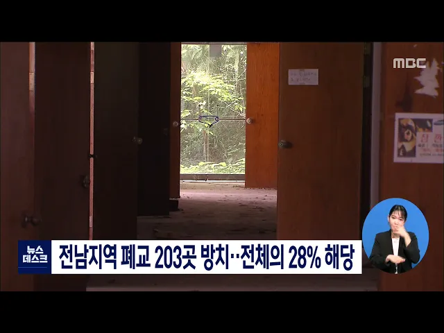 전남지역 폐교 10곳 가운데 세곳이 방치되고 있는 것으로 나타났습니다. 더불어민주당 강득구 의원이 교육청의 자료를 분석한 결과에 따르면전남지역 폐교는 707곳 가운데28%에 해당하는 203곳이 방치되고 있습니다. 또, 66%에 해당하는 467곳은 경작지와 도로, 주택부지, 주차장 등으로 활용되고 있습니다.
