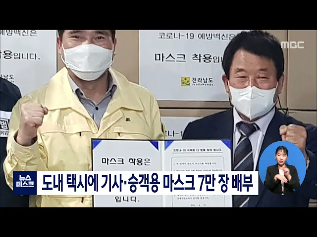 전라남도는 도내 개인*법인택시 운송종사자 7천여 명에게 KF94 방역마스크 7만여 장을 전달했습니다. 마스크와 마스크 착용 홍보 스티커 등을 전달받은 전남개인택시운송조합은 "택시 안에 마스크를 항상 비치해 종사자는 물론 승객 마스크 미착용 문제도 방지하겠다"고 밝혔습니다.