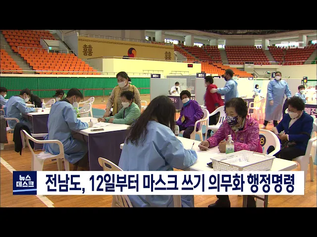 전라남도는 내일(12일)부터 마스크 착용 의무화 행정명령을 시행합니다. 이에 따라 앞으로는 사회적 거리두기 단계와 관계없이 모든 실내, 다른 사람과 2미터 이상 거리 유지가 어려운 실외에서는 반드시 마스크를 써야 합니다. 전라남도는 역학조사 과정이나 한 업소에서 동일인이 반복적으로 마스크를 착용하지 않아 적...