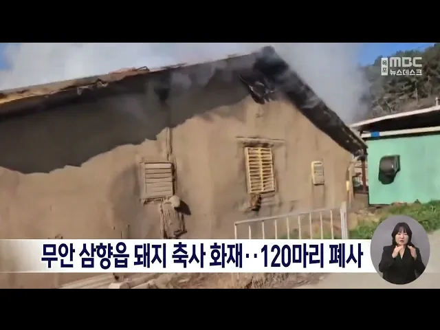 오늘 (6) 오전 10시 20분쯤무안군 삼향읍의 한 돼지 축사에서 불이 나40여 분만에 진화됐습니다.이 화재로 인명피해는 없었지만축사 1곳이 모두 타면서 돼지 120여 마리가 폐사했습니다.소방당국은 정확한 피해 규모와화재 원인을 조사하고 있습니다.