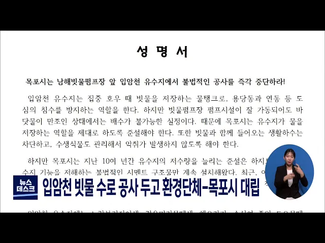 남해빗물펌프장 주변 입암천 유수지 안에 빗물 처리 시설 설치를 두고 환경단체와 목포시가 대립하고 있습니다. 목포환경운동연합은 성명을 내고 준설 등 근본적인 해법 없이 콘크리트 공사를 진행해 환경을 훼손하고 있다며, 즉각 중단하라고 주장했습니다. 이에 대해 목포시는 동아아파트 사거리 등 상습 침수 예방을 위...