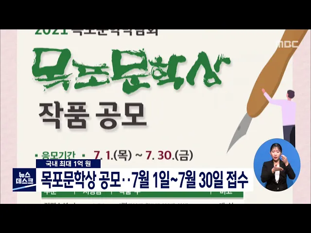 국내 최대 규모인 목포문학상 작품 공모가 오는 7월 1일부터 30일까지 진행됩니다. 오는 10월 국내 첫 문학박람회를 개최 예정인 목포시는 올해 열 세번째를 맞는 목포문학상의 상금을 장편소설 분야 1억 원, 시, 희곡, 평론 등에 각각 천만 원으로 높였습니다. 작품 접수는 오는 7월 1일부터 7월 30일까지며, 최종당선작...