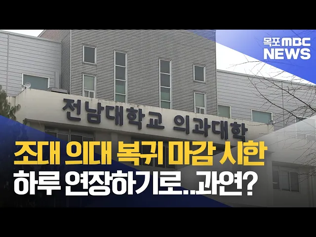 ◀ 앵 커 ▶요즘 의정갈등으로 학교를 떠났던지역 의대생들의 복학 여부가 관심사죠조선대 의대는 의대생 복귀를 위해복학 신청 마감을 하루 더 늦췄고,이미 제적 절차에 들어갔던 전남대 의대 경우엔복학 가능성이 아직 열려 있습니다.보도에 김영창 기자입니다.◀ 리포트 ▶조선대 의대가 의대생 복귀 마감 시한을 내일(28)까...