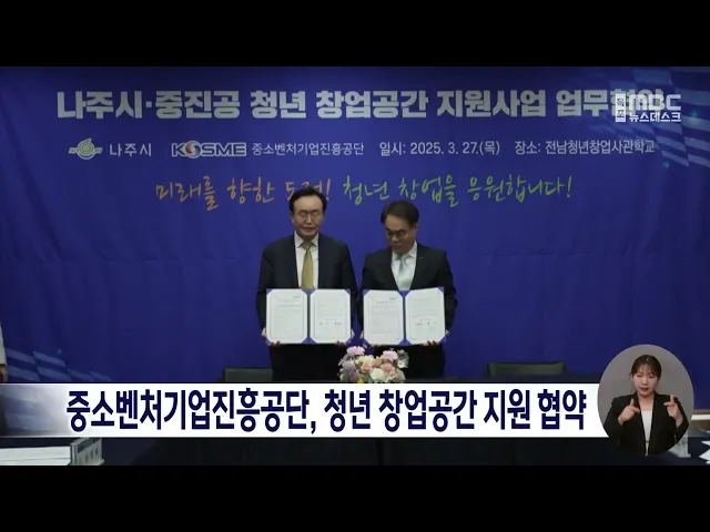 중소벤처기업진흥공단 전남지역본부와나주시가 청년 창업공간 지원 협력을 위한업무협약을 체결했습니다.두 기관은 전남청년창업사관학교 졸업 기업이지역에 정착하고 지속 성장을 할 수 있도록정책자금 등 맞춤사업을 지원하고사업장 제공과 임차료 지원에협력하기로 약속했습니다.
