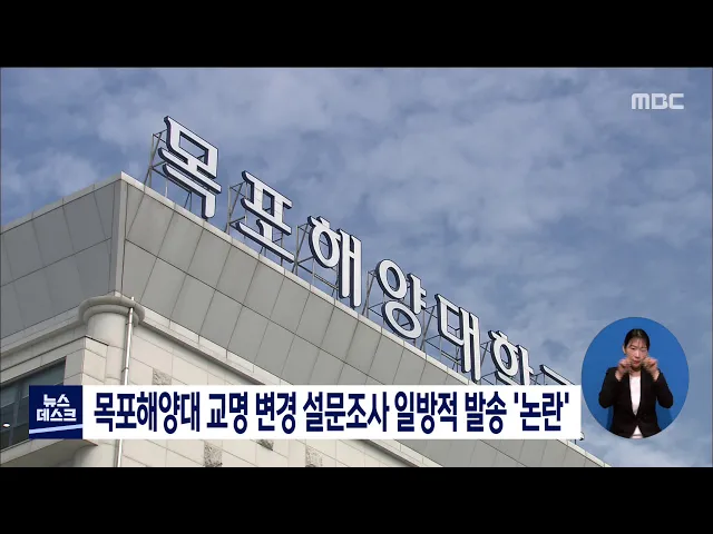 목포를 뺀 교명변경을 추진하고 있는 목포해양대학교가 목포시 동사무소에 교명변경 온라인 설문조사지를 일방적으로 보내 논란이 일고 있습니다. 목포해양대는 지난 26일부터 다음 달 7일까지 대학 교명변경과 관련해 시민들의 의견을 수렴한다며 목포시 23개 동사무소에 온라인 설문조사지를 발송했습니다. '목포'를 뺀 ...