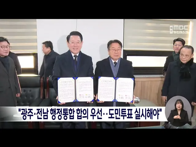 ◀ 앵 커 ▶김영록 전남지사가 오늘(5일)광주전남 행정통합 추진 출범 담화문을 발표하고 "속도가 경쟁력"이라며 통합에 대한 발 빠른 속도를 강조했습니다.다음 달 임시국회에서 광주전남 행정통합 특별법을 통과될 수 있도록 노력하겠다고 밝혀 오는 9일 대통령과 광주전남 국회의원,양시도지사가 참석하는 오찬 간담회가 ...