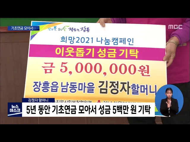 ◀ANC▶여든에 가까운 기초생활수급자 할머니가자신보다 어려운 이웃을 위해 써달라며 성금 5백만원을 기탁했습니다.생활비를 절약해서 아끼고 아껴 모은 돈인데요이 할머니야 말로 진정한 기부 천사가 아닐까 싶습니다.김양훈 기자가 취재했습니다. ◀END▶기초생활수급 대상자인올해 78살의 김정자 할머니부족한 생활...