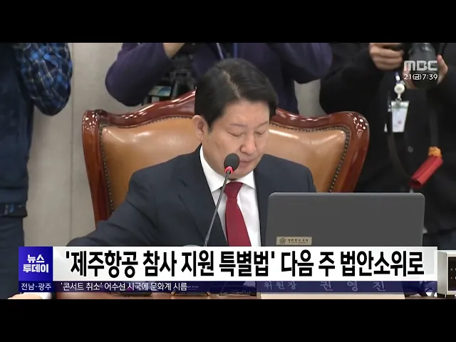12.29제주항공 여객기 참사피해자 지원을 위한 특별법이다음주 법안심사소위에 상정됩니다.국회 여객기참사 특별위원회는오늘(20) 국회에서 특별법 제정 공청회를 열고, 참사 피해 지원과 심리안정 회복,특별조사위원회 유족 참여와 2차 가해 처벌 등을 담은 특별법을 논의했습니다.여야 모두 참사 특별법에 이의가 없는 만...