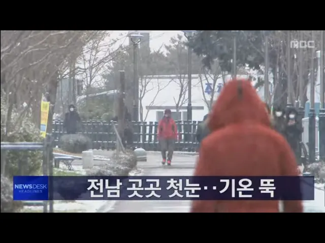 ◀ANC▶ 전남 서부권을 중심으로 첫눈이 내렸습니다. 반가운 첫 눈 소식도 있지만기온도 크게 떨어져코로나19와 조류인플루엔자 확산하지 않을까걱정해야 하는 상황입니다. 천호성 기자가 취재했습니다. ◀END▶ 목포 시내가 흰 눈으로 덮였습니다.◀I N T▶ 김민준 김창우 강대형 서재휘 *목포영화중 1학년*“오늘 첫 눈 와...