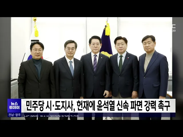 김영록 전라남도지사를 비롯한 더불어민주당 5명의 시·도지사는 오늘(10일)헌법재판소에 윤석열 대통령에 대한 파면 결정을 신속하게 내려줄 것을 강력히 촉구했습니다.시도지사들은 공동 입장문을 통해"윤석열 석방은 국민의 법 감정과 상식에 어긋나는 법 기술의 불상사”라며 이같이 요구했습니다.이들은 또, "탄핵이 기...