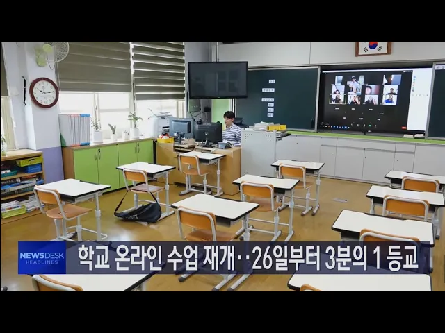 ◀ANC▶ 코로나 19가 전국적인 확산추세를 보이면서 전남지역 초중 학교에서는 오늘(24일)부터 온라인 수업이 재개됐습니다. 등교 규모는 모레인 26일부터 전체 학생의 3분의 1로 축소돼 교육현장에서도 대책 마련에 나서고 있습니다 김 윤 기자가 취재했습니다. ◀END▶ 지난 21일 2학기를 시작한 목포시내 한 초등학교...