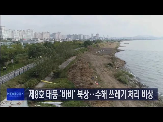 ◀ANC▶ 제8호 태풍 바비가 북상하면서 빠르면 내일(25)부터 전남 서남해안이 태풍의 간접적인 영향권에 접어들 것으로 보입니다. 그러나 지난 수해로 떠내려온 부유물 수거작업이 아직 끝나지 않아 걱정입니다. 김안수 기자가 취재했습니다. ◀END▶ 영산강 끝자락 200여미터 길이의 제방을 따라 쓰레기 산이 펼쳐져 있...