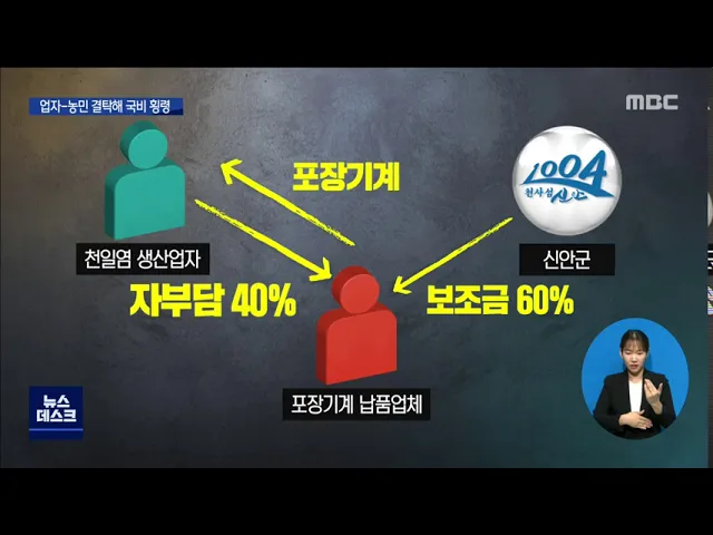 ◀ANC▶ 인력난을 겪는 천일염 생산자들에게 포장기계를 지원하는 사업이 복마전입니다. 염전 업자와 기계를 생산하는 업체들이 결탁해 수십억 원의 보조금을 횡령한 사실이 경찰 수사로 드러났습니다. 김안수 기자가 취재했습니다. ◀END▶ 염전에서 생산된 천일염을 포장하는 기계입니다. 인력난을 겪는 염전에는 반드...