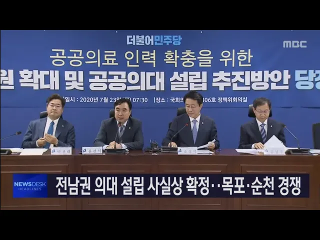 ◀ANC▶ 전남에 의과대학 설립이 마침내 확정됐습니다. 당정이 지역 의사제 도입을 골자로 16년만에 의대 정원을 확대하는데, 이 정원과 무관하게 전남에는 의대 신설이 이뤄질 전망입니다. 김진선 기자가 보도합니다. ◀END▶ ◀VCR▶ 민주당과 정부가 당정협의회를 열고 의과대학 정원 확대를 확정했습니다. ◀INT▶...