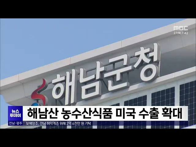 해남군과 미국 농식품 전문판매사인 울타리가해남산 농식품 수출 확대를 위한 업무협약을 체결했습니다.협약을 통해 해남군은 수출 제품 발굴과 상품화 지원으로안정적인 공급에 노력하고,울타리사는 온오프라인 마케팅을 통해해남산 농수산식품의 유통 판매에 나설 계획입니다.