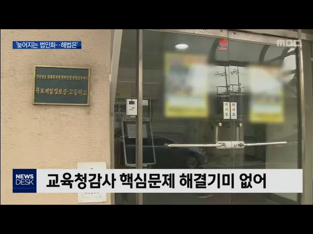 ◀ANC▶ 설립자 가족들 간의 갈등으로 내홍을 겪고 있는 목포 제일 정보 중고등학교의 법인화가 늦어지고 있습니다. 법인화가 지연되는 가장 큰 이유는 학교 이설 예정부지 보상금과 설립자 차남에게 증여된 부지의 원상복구를 두고 전남교육청과 설립자 측의 의견이 평행선을 달리고 있기 때문입니다. 김 윤 기자가 취재...