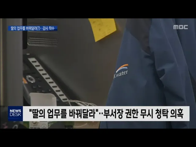 ◀ANC▶ 한국수자원공사 직원이 자신의 딸이 근무하는 다른 지역 수도관리단을 찾아가 딸의 업무를 바꿔달라는 청탁을 했다는 의혹이 제기됐습니다. 한국수자원공사 측은 매우 이례적인 일이라며, 감사에 착수했습니다. 박영훈 기자가 취재했습니다. ◀END▶ 30여 명의 직원이 근무중인 한국수자원공사 진도수도관리단. ...