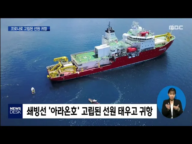 ◀ANC▶ 쇄빙 연구선 '아라온호'가 오늘(29) 광양항에 도착했습니다. 코로나19로 인해 파푸아뉴기니에 고립됐던 우리나라 원양어선 선원들을 마침 남극 연구를 마친 아라온호가 태우고 귀항한 건데요. 입국자들 중 코로나 확진자는 없지만 혹시 모를 가능성을 대비해 승선원 모두 2주간 격리될 예정입니다. 강서영 기자입...