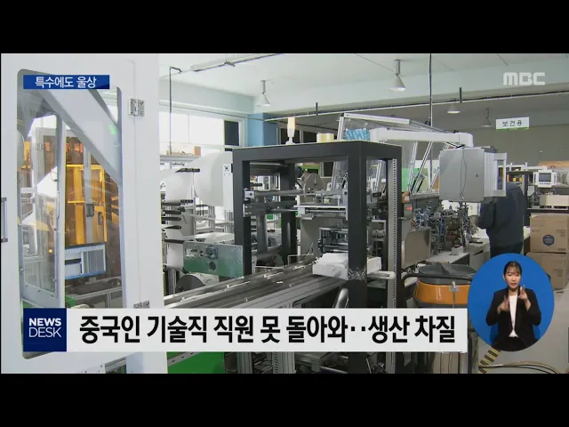 ◀ANC▶ 신종 코로나 여파로 마스크 품귀 현상이 빚어지면서 마스크 생산 공장은 쉴새 없이 가동되고 있습니다 그러나 중국인 기술직 직원들의 국내 입국이 지연되고, 중국산 원재료 수입마저 끊기면서 가동 중단 위기를 맞고 있습니다. 김안수 기자가 취재했습니다. ◀END▶ 전남 영암군 대불자유무역지역의 마스크 제조...