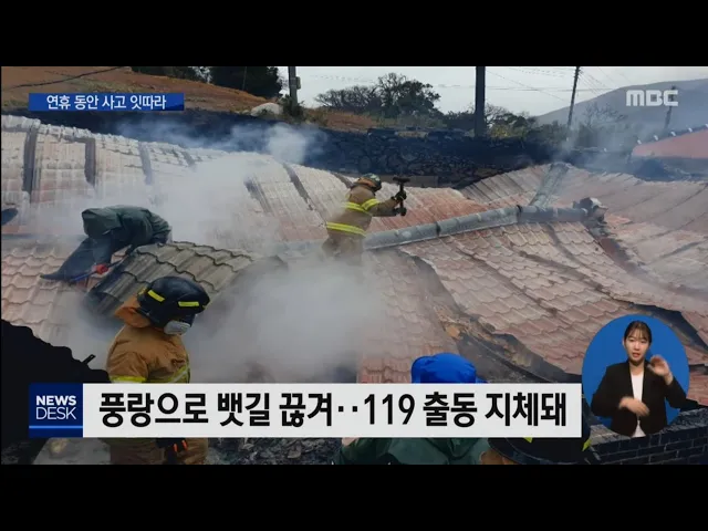 ◀ANC▶ 설 연휴동안 화재가 나는 등 사고가 잇따랐습니다. 해상에선 조업 중이던 선원이 실종돼 해경이 수색을 벌이고 있습니다. 김안수 기자가 취재했습니다. ◀END▶ 어두운 섬 마을의 한 주택에서 시뻘건 불길이 치솟습니다. 오늘(27) 새벽 4시 45분 쯤, 완도군 보길면 84살 정 모씨의 집에서 누전으로 추정되는 불이...