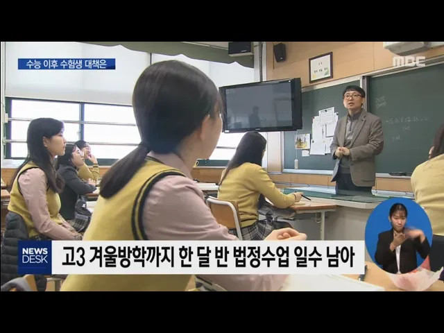 ◀ANC▶ 대학입학 수학능력시험이 끝난 고3 교실은 해방감과 허탈함이 교차하고 있습니다. 수험생들은 수업일수를 채우기 위해 방학까지 한 달 반 동안 학교에 가야하는데 학교와 교육당국도 학생지도 대책마련에 해마다 고민을 되풀이하고 있습니다. 김 윤 기자가 취재했습니다. ◀END▶ 대입 수학능력시험이 끝난 고3 ...