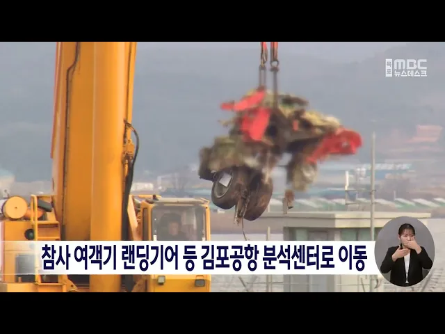12.29 제주항공 여객기 참사 원인 조사를 위해 랜딩기어 등 일부 장치가김포공항 분석센터로 옮겨졌습니다.국토교통부 항공철도사고조사위원회는어젯밤(20)부터 오늘(21) 아침까지 크레인과 트레일러 등을 이용해 사고 여객기 랜딩기어와 중요 부품 등을 김포공항에 있는 분석센터로 이동시켰다고 밝혔습니다.조사위원회는 ...