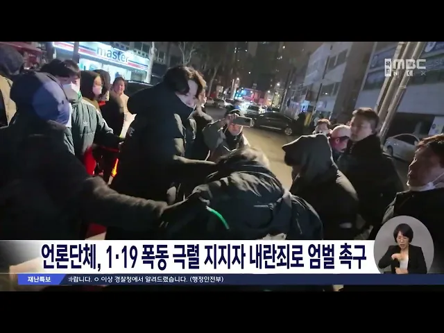 방송기자연합회와 전국언론노동조합 등 9개 언론단체는1.19 폭동을 일으킨 극렬지지자들을내란죄로 엄벌해야한다고 촉구했습니다.이들은 서울서부지방법원에 난입한 극렬지지자들이 현장 취재진에 대해무차별적인 폭행과 취재 장비, 소지품을 탈취하는 테러를 가했다며민주주의 파괴행위라고 비판했습니다.또 이번 사태를'...