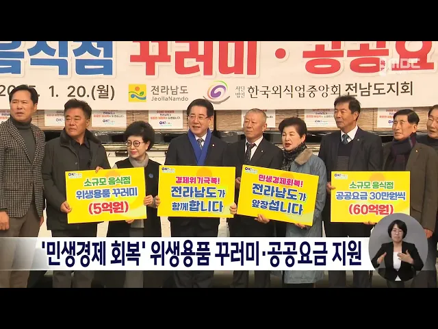 계엄 여파 등으로 어려운 민생경제 조기 회복을 위한위생용품 꾸러미 전달식이 열렸습니다.오늘(20) 전남도청에서 열린 행사에는김영록 도지사와 외식업계 관계자 등 30여 명이 참석한 가운데 앞치마와 포장 용기 등 5만 원 상당의 위생용품 꾸러미 1만 개가 전달됐습니다.전라남도는 이와 함께 다음 달까지 연매출 1억 4백...
