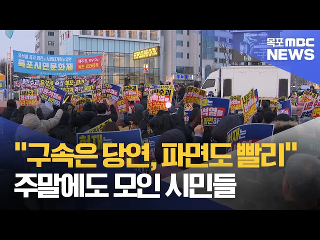 ◀ 앵 커 ▶내란 우두머리 혐의를 받는윤석열 대통령이 구속된 주말,시민들은 또다시 거리로 나왔습니다.시민들은 구속에 이어파면까지 빠르게 이어져야 한다면서도구속영장 등 대통령 수사에 계속반대 입장을 보였던 여당도 책임져야 한다고 목소리를 높였습니다.최다훈 기자입니다.◀ 리포트 ▶윤석열 대통령이관저로 돌아가...