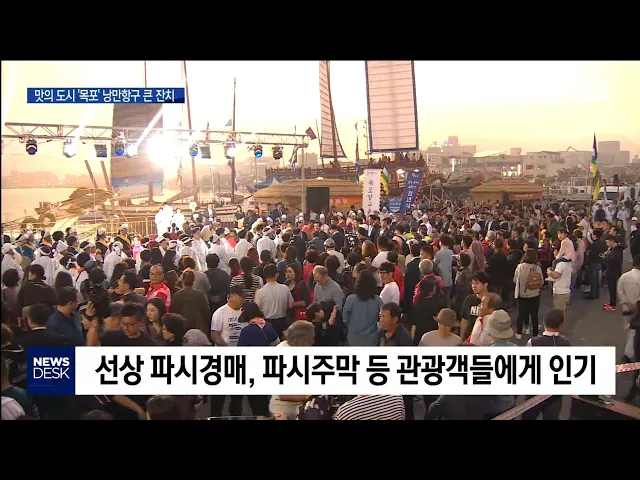 ◀ANC▶ 2019 목포항구축제가 목포항과 삼학도 일원에서 열리고 있습니다. 선상 시장인 '파시'와 목포의 대표 음식을 맛볼 수 있는 기회를 제공하며 관광객과 시민들의 발길을 붙잡고 있습니다. 김양훈 기자가 취재했습니다. ◀END▶ 목포의 과거와 현재, 미래를 볼 수 있는 목포항구축제 축제가 열리고 있는 목포항 일원...
