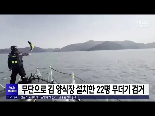 허가 구역이 아닌 곳에서 면허도 없이 양식장을 설치한 수십 명이 해경에 붙잡혔습니다.완도해양경찰서는 어제(14) 완도군 금일도 인근 해상에서무단으로 김 양식장을 설치한 혐의로22명을 검거했다고 밝혔습니다.불법 양식 행위는 사법처리되거나 어업면허 취소 등 행정처분을 받게 되며, 불법 시설물은 자진 철거하지 않...