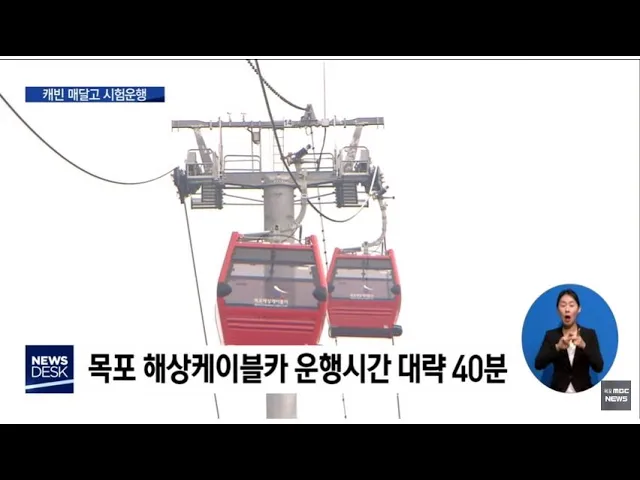 ◀ANC▶ 목포 해상케이블카 공사시작 23개월 만인 오늘(16일) 처음으로 캐빈을 메인 케이블에 매달고 운행했습니다. 시운전 결과 캐빈 운행에는 이상이 없어 다음 달 6일 공식 개통에는 차질이 없을 전망입니다. 김 윤 기자가 취재했습니다. ◀END▶ 유달산과 고하도를 연결하는 해상 케이블에 승객들이 탑승하는 '캐빈'...