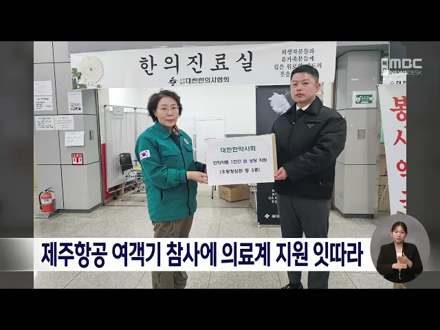 제주항공 여객기 참사 피해자 가족들을 위한 의료계의 지원이 잇따르고 있습니다.대한한약사회는 어제(9) 전라남도에 우황청심환 등 심리적 안정 등을 돕는 1천만 원 상당의 한방의약품을 전달했으며,앞서 전남도한의사협회와 전남도약사회도각각 3천만 원과 4천만 원 상당의의약품을 지원했습니다.