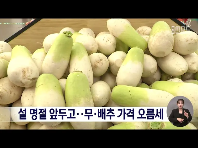 겨울철 기온 하락으로 산지 출하 작업이 부진한 무와 배추 가격이오름세를 보이고 있습니다.한국농수산식품유통공사, aT에 따르면현재 무 소매가격은 개당 3천 330원으로 지난해 대비 50% 이상 올랐고, 배추 1포기당 가격도 5천 660원으로 41퍼센트 올랐습니다.배와 사과도 설연휴 출하 대비저장이 이어지면서 일시적으로 ...