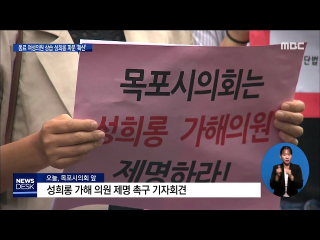 ◀ANC▶ 목포시의회 여성의원이 동료 남성 의원에게 상습적으로 성희롱을 당했다는 주장이 제기되면서 파문이 확산되고 있습니다. 시민단체들은 의원직 제명을 요구하고 나섰는데 해당 의원은 관련 사실을 부인하고 있습니다. 김 윤 기자가 보도합니다. ◀END▶ EFFECT (제명하라.. 제명하라) 시민단체들이 동료 여성의원...