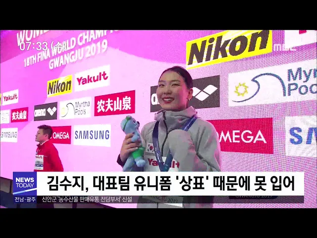 (앵커) 광주세계수영대회에 출전한 우리나라 선수들이, 규정에 맞지 않는 유니폼을 입고 출전해 국제적 망신을 사고 있습니다. 우리나라 이름도 적히지 않은 수영모자를 쓰고 경기에 나갔다 매직펜으로 KOREA라고 써서 출전하는 어처구니 없는 일이 벌어지기도 했습니다. 우종훈 기자가 취재했습니다. (기자) 바다의 마라톤...