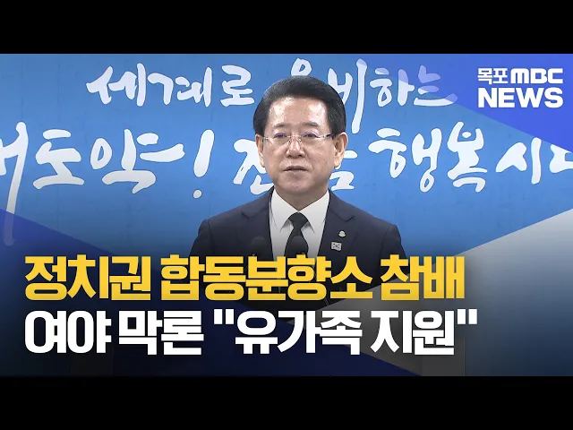◀ 앵 커 ▶안타까운 참사에 여야 정치권은 일제히 사고 현장을 찾았습니다.큰 슬픔에 빠진 유가족을 위로하고 실질적인 지원을 약속하는 데에는여야가 따로 없었습니다.최황지 기자입니다.◀ 리포트 ▶제주항공 여객기 참사로 179명의 희생자가 발생하자, 전남도는 모든 자원을 유가족 지원에 쏟겠다고 말했습니다.◀ SYNC ▶ *...