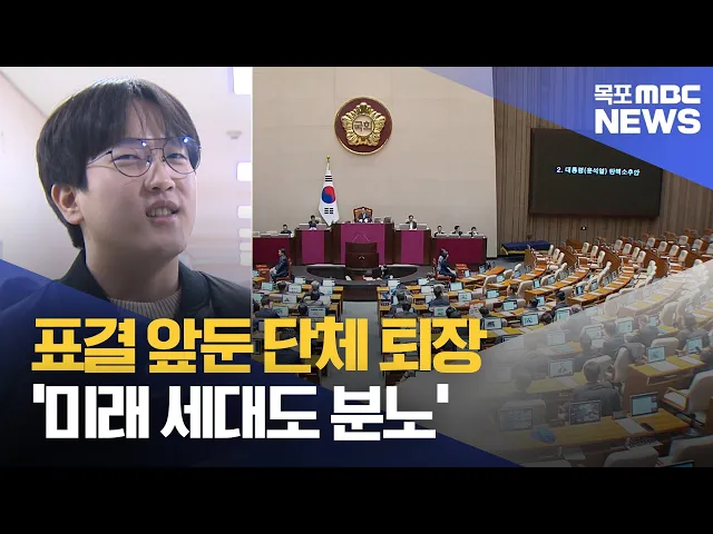 ◀ 앵 커 ▶윤석열 대통령의 탄핵소추안 표결 직전 단체로 퇴장해버린 국민의힘 의원들을 향해미래세대인 2030세대들이 크게 분노하고있습니다.미래세대들은 "자신들의 안위가 아닌 국민을 생각하라"며윤석열 대통령 탄핵에 동참하라고 한목소리를내고 있습니다.◀ INT ▶ 이승원/대학생"본인들의 의사를 제대로 전달하기 위해 ...