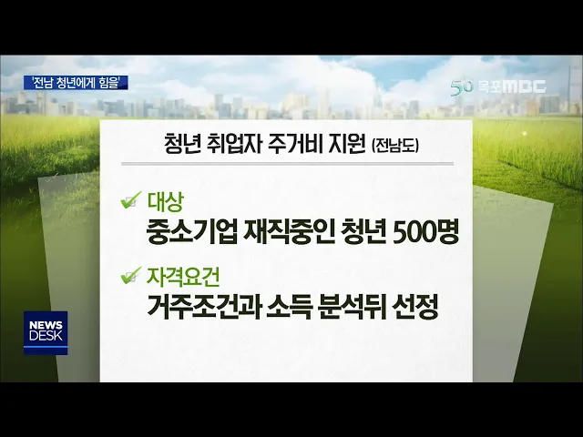 ◀ANC▶ 전라남도가 내년부터 도내 청년들을 위한 다양한 맞춤형 지원책을 시행합니다. ◀VCR▶ C/G] 먼저 일자리입니다. 일하고 싶어 구직활동에 나서는 청년들에게 수당이 지원됩니다. 한달 50만 원 씩 최대 6개월 동안입니다. =========================================== < 청년구직활동 수당 지원 > 자원 자격: 대...
