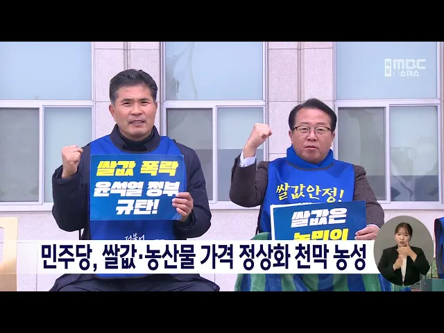 더불어민주당 국회의원들이지난달 31일부터 국회에서 쌀값과농산물 가격 정상화를 촉구하는 농성을벌이고 있습니다.서삼석, 문금주 등 민주당 농해수위 의원 10명은 쌀값 하락을 막지 못한 농림축산식품부 장관 사퇴와 함께 양곡법 개정안 통과와 2024년산 쌀값 20만 원 유지를 위한추가 시장 격리 등을 정부에 촉구하고 있...