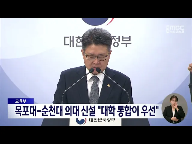 교육부는 목포대와 순천대가 국립 의과대학 신설을 위해 대학 통합에 합의한 것과 관련해, 통합 대학으로서의 지위를 확보하는 것이우선 과제라고 밝혔습니다.또 의대 정원 증원과 신설은 복지부와의 협의를 통해 결정돼야 하는 만큼 교육부 단독으로는 판단할 수 없다면서, 필요한 컨설팅과 지원을 제공하겠다고 강조했습...