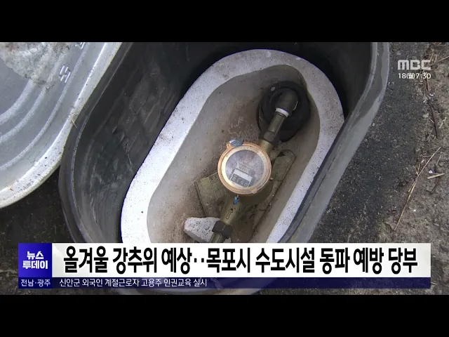 목포시는 올겨울 강추위가 예고되는 만큼 주민들에게 수도시설 동파예방을 당부했습니다.목포시는 수도시설 동파예방법으로수도계량기와 외부로 드러나 있는 수도관을 헌 옷, 스티로폼, 헝겊 등으로 감싸 보온해 줄 것을 요청했습니다.목포시는 겨울철 수도시설 동파에 따른 시민불편을 최소화하기 위해 내년 3월까지 24시...