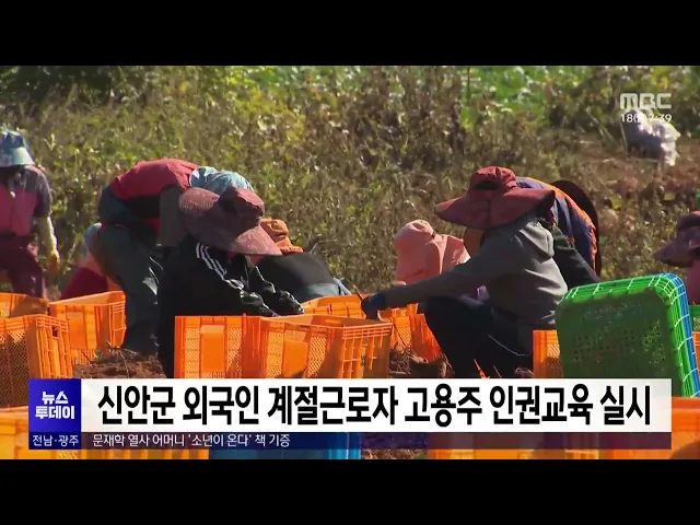 신안군은 최근(14일) 농업분야 외국인 계절근로자 100여 명의 고용주를 대상으로 인권보호를 위한 교육을 실시했다고 밝혔습니다.신안군은 올해 외국인 계절근로자 611명이 입국해 농업 현장에서 최대 8개월간 근로계약을 통해 일하고 있다며, 계절근로자 대부분은 국민과 결혼한 이민자 가족이 친척 초청 방식으로 들어오...
