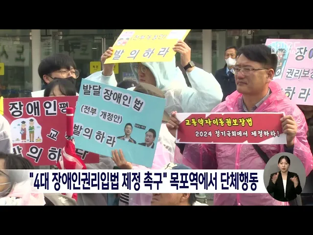 장애인 단체들이 4대 장애인권리입법의연내 제정을 촉구하는 단체 행동을 벌였습니다.전남장애인자립생활센터협의회 등 4개 단체는 오늘(4) 목포역 앞에 모여 장애인 이동권과 자립 생활 지원 확대를 위한 4대 장애인권리입법을 22대 정기국회 회기 내로통과시켜야 한다고 촉구했습니다.이날 전국 동시다발로 진행된 '다이...