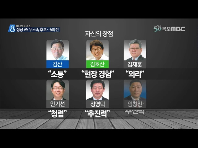 ◀ANC▶ 현직 군수가 비리로 낙마한 가운데 치러지는 무안군수 선거에는 2명의 정당 후보와 4명의 무소속 후보가 출마했습니다. 후보 6명의 이력과 핵심공약을 박영훈 기자가 취재했습니다. ◀END▶ 출마 이유와 함께 무안의 상징적인 이름으로 더불어민주당 김산 후보는 '잘사는 무안', 민주평화당 김호산 후보는 '부자 ...