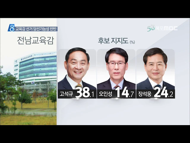 ◀ANC▶ 이처럼 신경전이 치열한 전남교육감 선거, 예고해 드린대로 목포MBC 여론조사 결과를 지금부터 발표합니다. 3명의 후보 가운데 지지도는 고석규 후보가 앞섰지만, 당선 가능성에서는 고석규, 장석웅 후보가 팽팽히 맞서고 있습니다. 장용기 기자가 보도합니다. ◀VCR▶ 교육감 지지도에서 가장 앞선 후보는 고석...