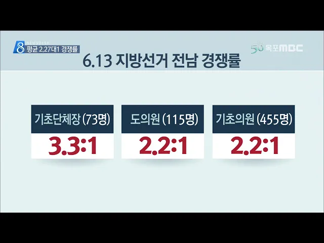 ◀ANC▶ 6.13 지방선거 후보 등록이 지난 25일 모두 마감됐습니다. 전남에서는 여당인 민주당에 맞서 민주평화당 등 야당과 무소속 후보들이 얼마나 선전할 수 있을지 관심입니다. 김양훈 기자가 보도합니다. ◀END▶ 6.13 지방선거에서 전남은 평균 2.27대 1의 경쟁률을 보였습니다. 전남지사 선거는 김영록,박매호,민영...