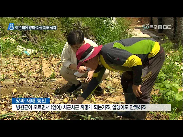 ◀ANC▶ 올들어 남부 지방에 잦은 비가 내리면서 습기에 약한 밭작물의 피해가 심각합니다. 특히, 과잉 생산으로 수확철을 맞아 가격이 폭락한 양파와 마늘 재배 농가는 엎친데 덮친 격으로 병까지 확산되면서 울상입니다. 박영훈 기자가 현장 취재했습니다. ◀END▶ 양파 주산지인 전남 무안의 한 양파밭입니다. 수확철...
